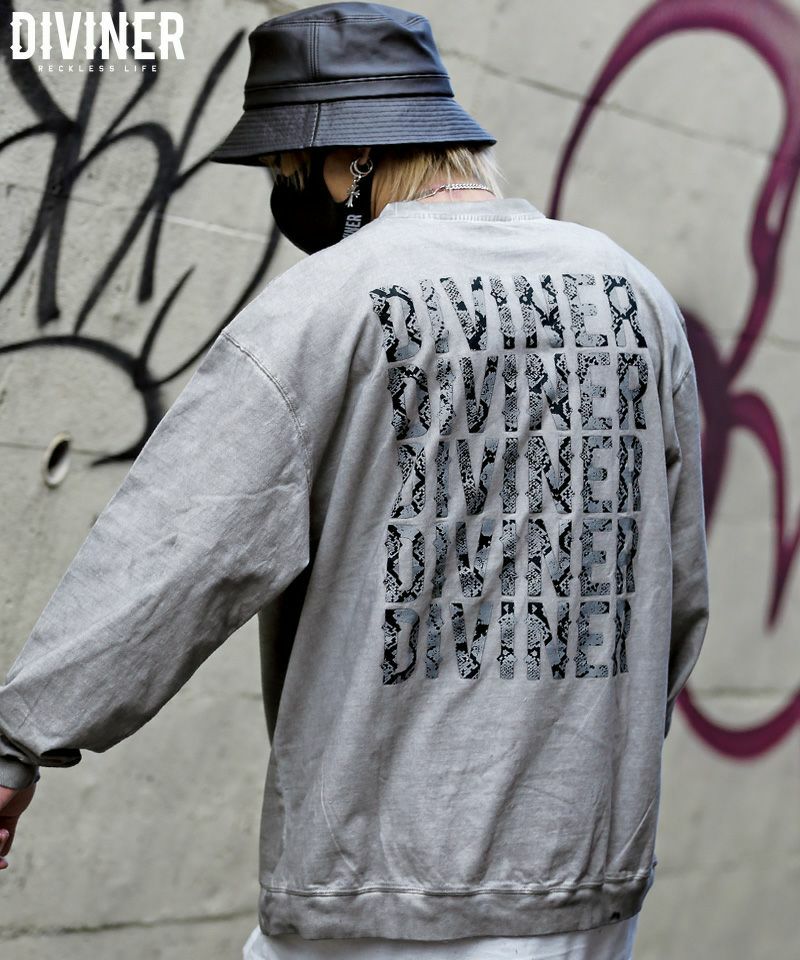 【パイソンロゴスウェットシャツ】妥協なく生きる者は日々新しくなる。「RECKLESS LIFE=妥協のない生き様」を歩む者達へ、DIVINERから「Pythonlogo Sweat」が登場。デザインはアイスグレーのボディに、ブランドロゴを左胸、バックに成長と共に脱皮を繰り返し、「生まれ変わること」を象徴するパイソン(蛇)の柄で刻んだ存在感のあるデザイン。サイジングは、トレンド且つストリートファッションを楽しめるオーバーサイズシルエット。妥協なく生きる者は、日々刷新される。