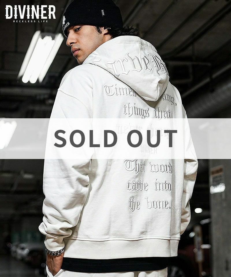 【BlackLetter】Rear Embroidery Cross Hoodie/リアエンブロイダリークロスフーディー「RECKLESS LIFE=妥協のない生き様」を歩む者達へ、DIVINERからRear Embroidery Cross Hoodie(オフホワイト)が登場。●Design/デザインバックにオールドイングリッシュの厚盛刺繍を刻んだZIPパーカー。フロント左胸部分にもロゴを刺繍。ZIPはYKK仕様。【DIVINER】RECKLESS LIFE―妥協のない生き様最後は誰だって骨になる。ただ骨が残るのか。それとも骨を残すのか。何が残る。何を残す。【モデル着用サイズ:FREE】身長187cm#パーカー#ZIPパーカー#フーディー#HIPHOP#ヒップホップ#韓国ストリート#ストリート系#ストリートファッション#DIVINER#ディバイナー