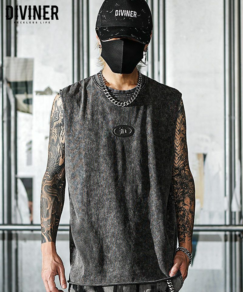Dirty Creed Nosleeve●Design/デザインムラ感のある抜染ボディにメタルプレートを配置したノースリーブ。バック裾に同色のブランドロゴをプリント。左裾にはピス付き。【モデル着用サイズ:M】身長173cm/体重60kg#抜染#ムラ#タイダイ#Tシャツ#スプラッシュ#HIPHOP#ヒップホップ#韓国ストリート#ストリート系#ストリートファッション#DIVINER