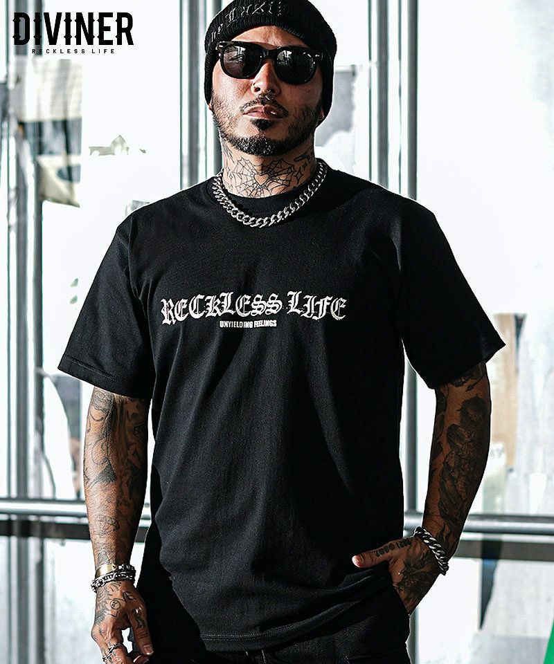 【BLACK LETTER】Evilways TEE(ブラック/ホワイト)●Design/デザインブラックレター(オールドイングリッシュ)ロゴをフロント、バックにデザインした半袖Tシャツ。左袖にはクロスを刺繍。右裾にはピスを配置。【モデル着用サイズ:M】身長170cm/体重65kg