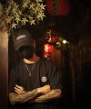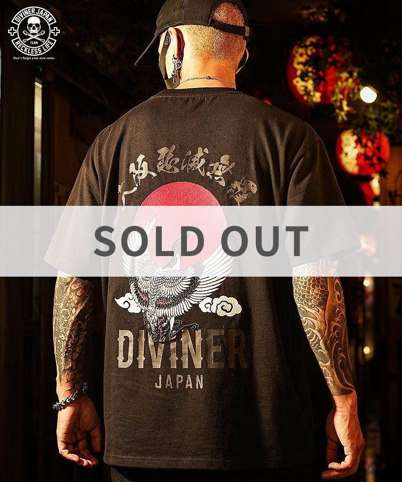 【DIVINER JAPAN】掃溜鶴 TEE●Design/デザインバックに漢字と刺繍でデザインを刻んだ半袖Tシャツ。フロントには日の丸仕様のサークルスカルをデザイン。左裾にピスを配置。【モデル着用サイズ:M】身長173cm/体重60kg