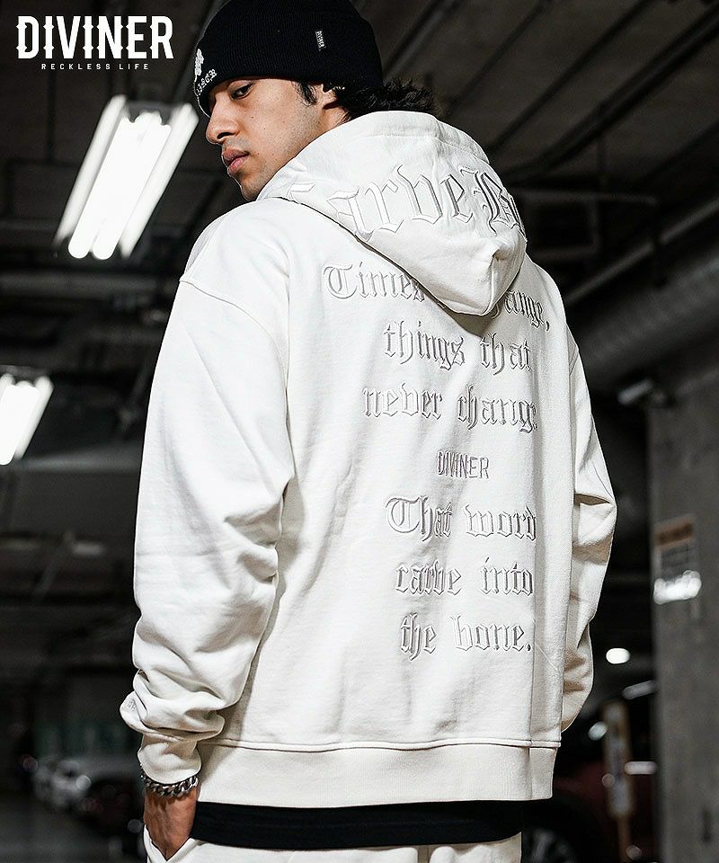 【BlackLetter】Rear Embroidery Cross Hoodie/リアエンブロイダリークロスフーディー「RECKLESS LIFE=妥協のない生き様」を歩む者達へ、DIVINERからRear Embroidery Cross Hoodie(オフホワイト)が登場。●Design/デザインバックにオールドイングリッシュの厚盛刺繍を刻んだZIPパーカー。フロント左胸部分にもロゴを刺繍。ZIPはYKK仕様。【DIVINER】RECKLESS LIFE―妥協のない生き様最後は誰だって骨になる。ただ骨が残るのか。それとも骨を残すのか。何が残る。何を残す。【モデル着用サイズ:FREE】身長187cm#パーカー#ZIPパーカー#フーディー#HIPHOP#ヒップホップ#韓国ストリート#ストリート系#ストリートファッション#DIVINER#ディバイナー