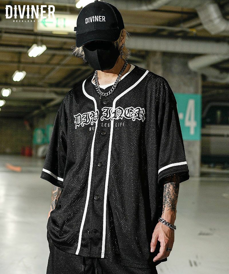 Vertex Baseball Shirt●Design/デザインフロントにオールドイングリッシュで刺繍を配置したベースボールシャツ。ボディはメッシュ素材。別売りのショーツと合わせてセットアップとして着用可能。【モデル着用サイズ:M】身長173cm/体重60kg#ベースボールシャツ#シャツ#セットアップ#HIPHOP#ヒップホップ#韓国ストリート#ストリート系#ストリートファッション#DIVINER