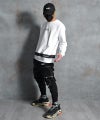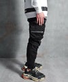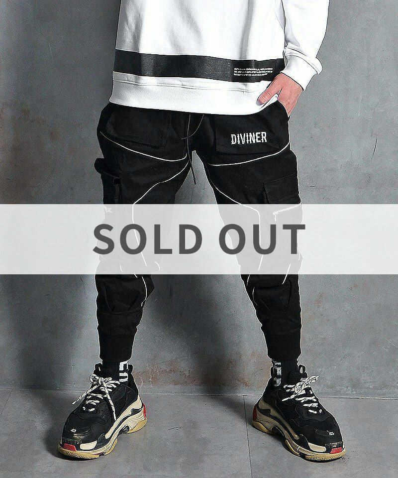 〔Piping reflector cargopants〕暗いところで光を当てると反射するパイピングリフレクター仕様のカーゴパンツ。リフレクター使いはストリートシーンで人気を誇っており、SNS映えも抜群。またパイピングで表現することでトップスをブラックカラーで合わせたブラックコーデでも存在感を発揮してくれる。裾はリブ仕様になっており、普通に穿いてもよし、ソックスを見せるスタイルでもよし。