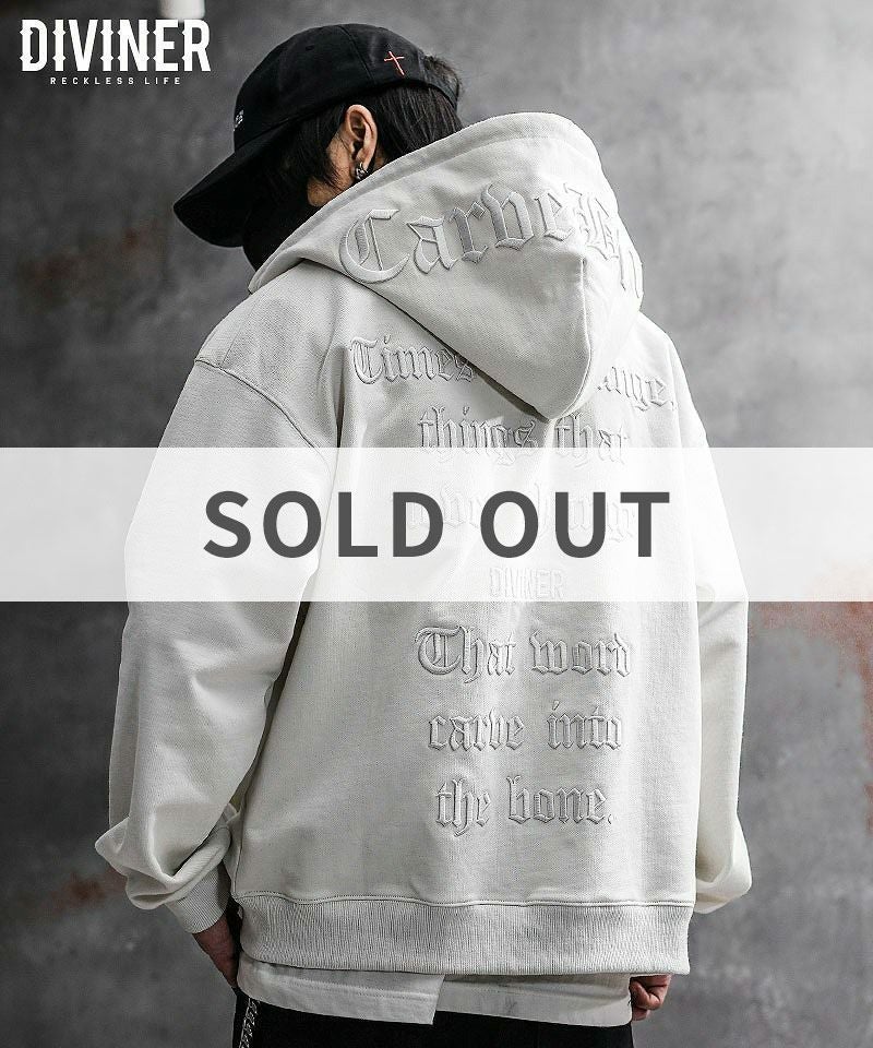 【BlackLetter】Rear Embroidery Zip Hoodie/リアエンブロイダリージップフーディー「RECKLESS LIFE=妥協のない生き様」を歩む者達へ、DIVINERからRear Embroidery Zip Hoodieが登場。●Design/デザイン背面に同色で刺繍を施したジップパーカー。左袖口にも同色でブランドロゴを刺繍。ジップはYKK仕様。【モデル着用サイズ:M】身長173cm/体重60kg#フーディー#パーカー#ジップパーカー#刺繍#ブラックレター#オールドイングリッシュ