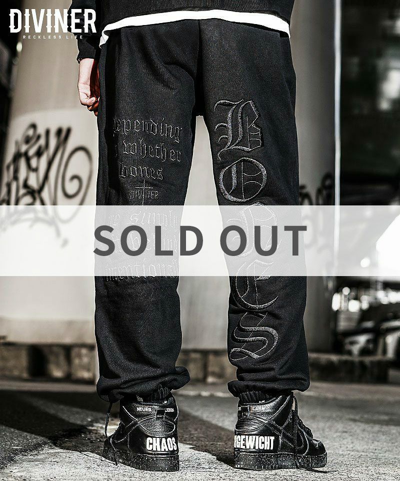 【BlackLetter】Rear Embroidery Cross Sweat Pants/リアエンブロイダリークロススウェットパンツ「RECKLESS LIFE=妥協のない生き様」を歩む者達へ、DIVINERからRear Embroidery Cross Sweat Pants(ブラック)が登場。●Design/デザインバックにオールドイングリッシュの厚盛刺繍を刻んだスウェットパンツ。フロント左ポケット部分にもロゴを刺繍。裾はリブ仕様。【DIVINER】RECKLESS LIFE―妥協のない生き様最後は誰だって骨になる。ただ骨が残るのか。それとも骨を残すのか。何が残る。何を残す。【モデル着用サイズ:FREE】身長187cm#スウェットパンツ#ジョガーパンツ#HIPHOP#ヒップホップ#韓国ストリート#ストリート系#ストリートファッション#DIVINER#ディバイナー