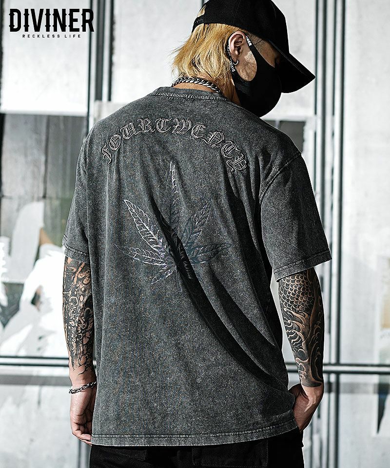 【420 WEED】Weed Illusion TEE(ブラック)●Design/デザインバックにオリジナルのWEEDデザインを配置した半袖Tシャツ。フロントにもデザインを配置。左裾にはピス付き。【モデル着用サイズ:M】身長173cm/体重60kg#WEED#ウィード#420#Tシャツ#HIPHOP#ヒップホップ#韓国ストリート#ストリート系#ストリートファッション#DIVINER