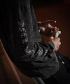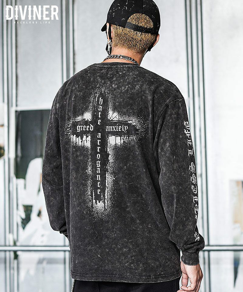 Dirty Deadly Sin L/TEE●Design/デザインバックにかすれ加工を施したクロスをデザインした長袖Tシャツ。右袖にもかすれ加工のロゴを配置。フロント左胸にはロゴを配置。左裾にはピス付き。【モデル着用サイズ:M】身長173cm/体重60kg※ヴィンテージ加工を施しているため、1点1点風合いや加工感に個体差があります。