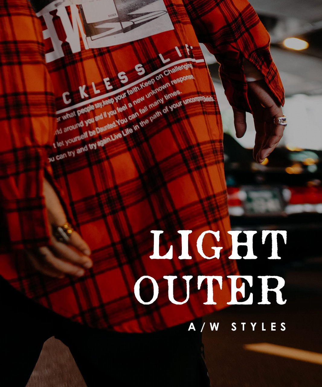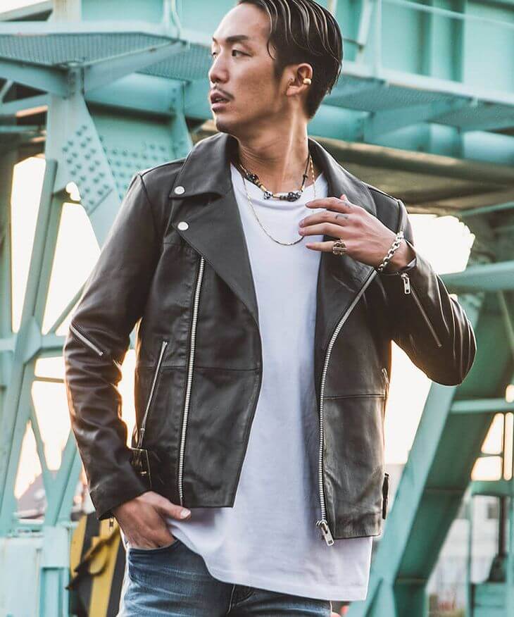 タイトに着用する印象のライダースやGジャンですが、やや大きめのサイズを選ぶことでストリートなスタイルにもマッチする優れもの。