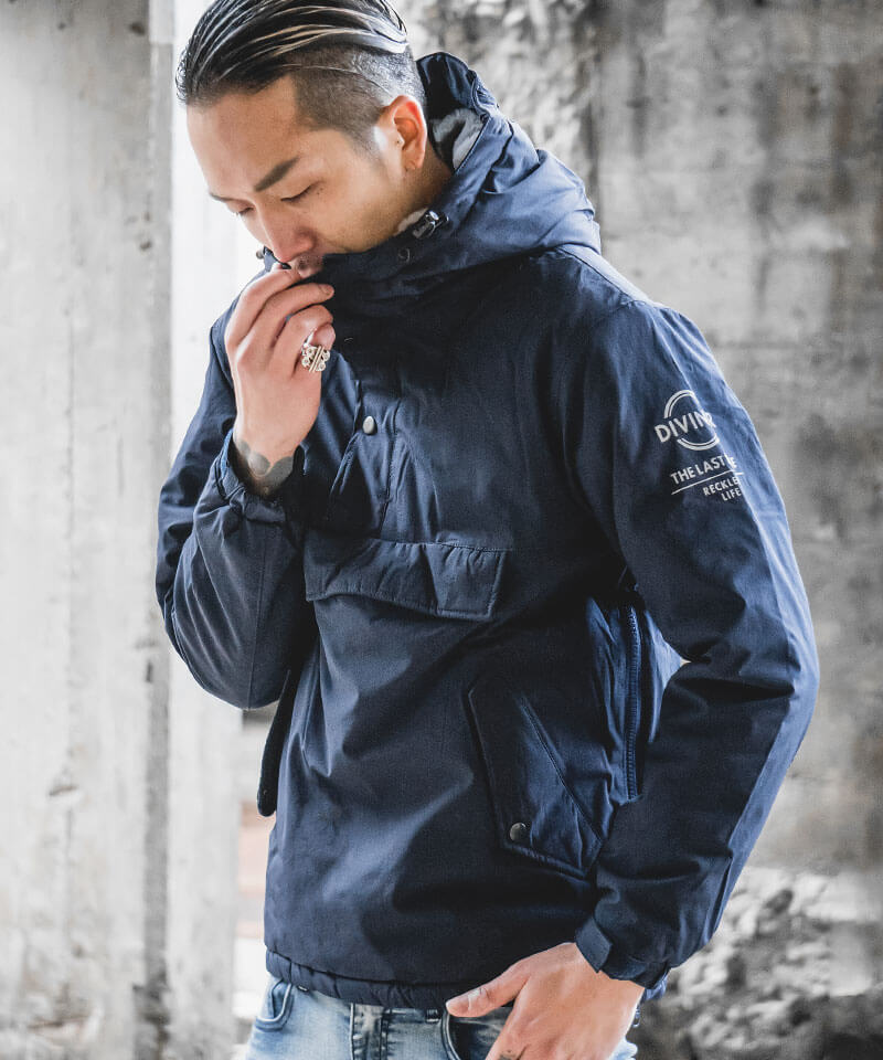 フードのあるパーカーなど、中にボリュームを持たせてもコーデを崩さない機能美。