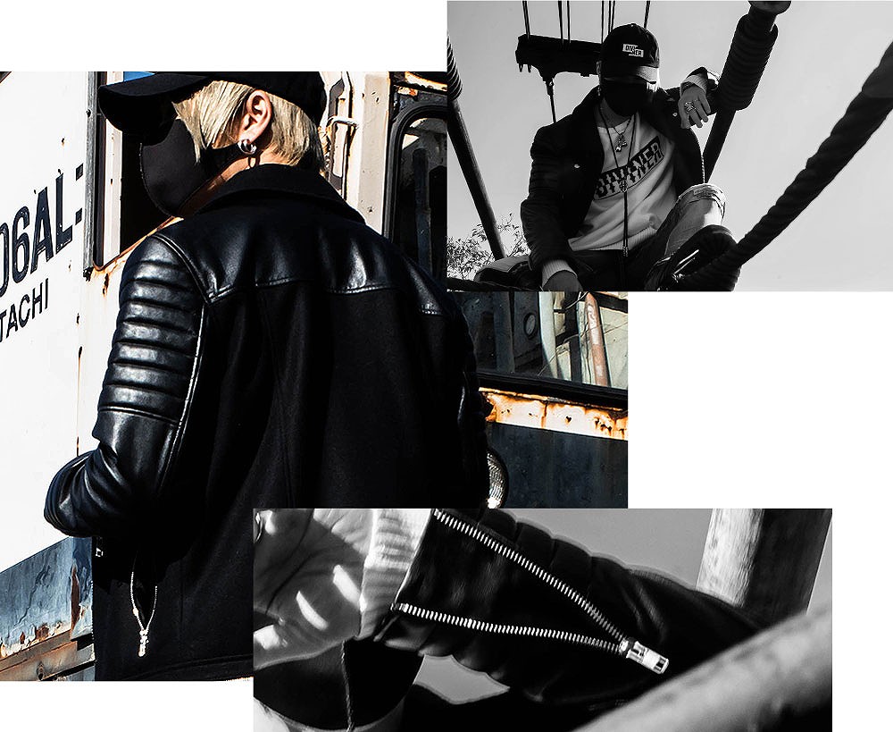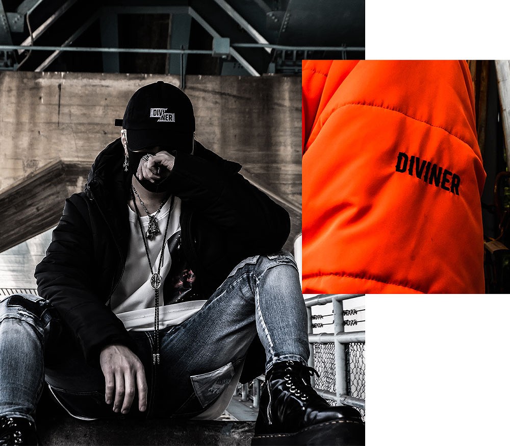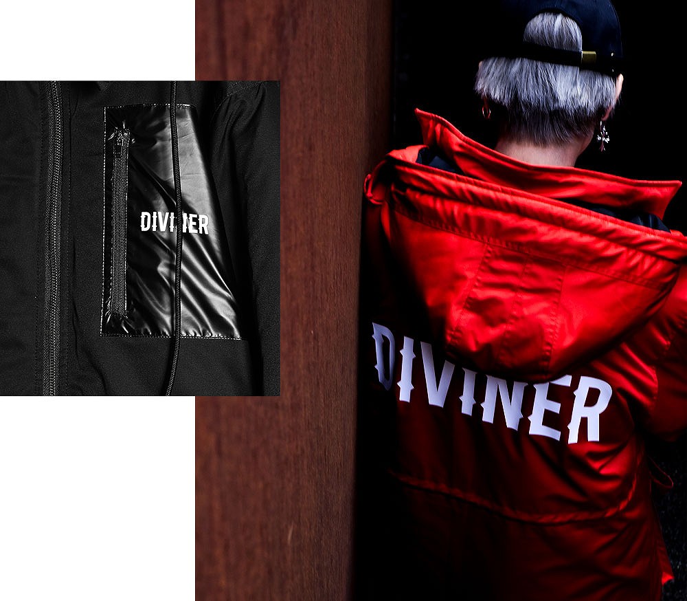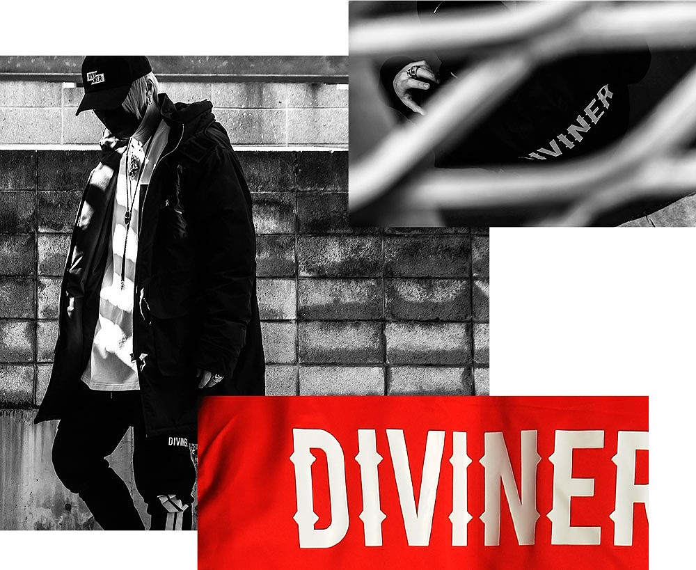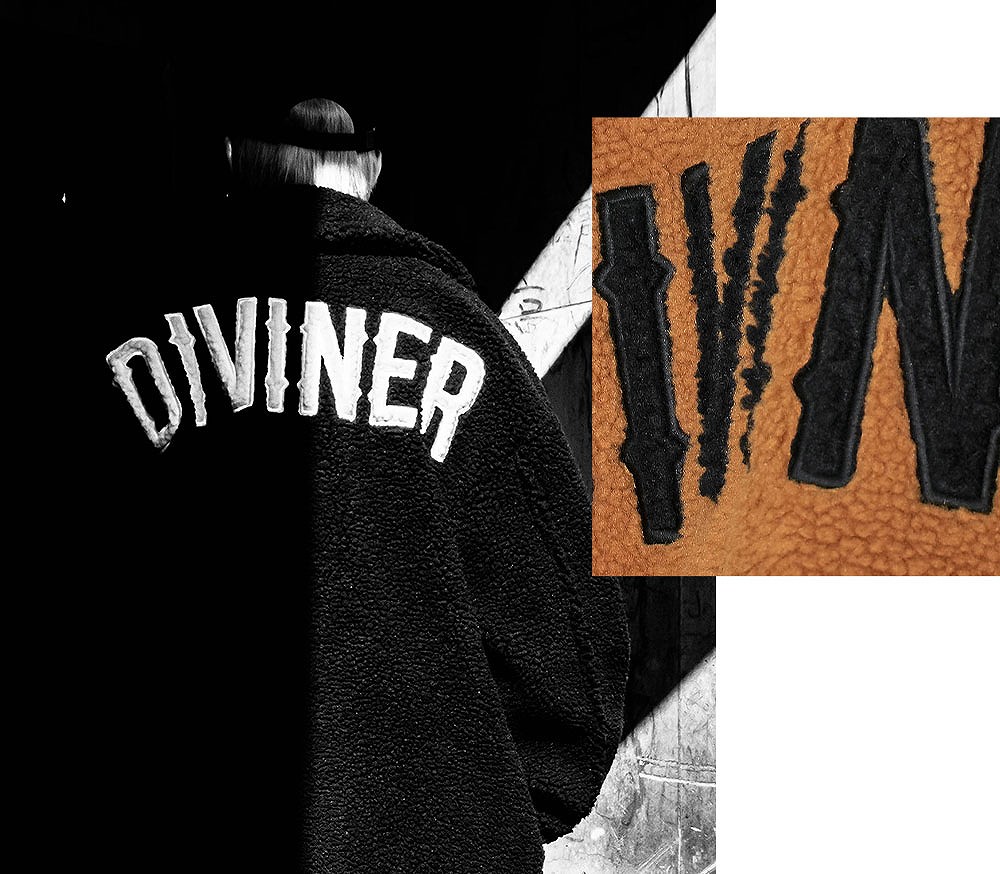 左腕に刻まれた”DIVINER”の小さな刺繍から放つ存在感が、シンプルに強さを与える。