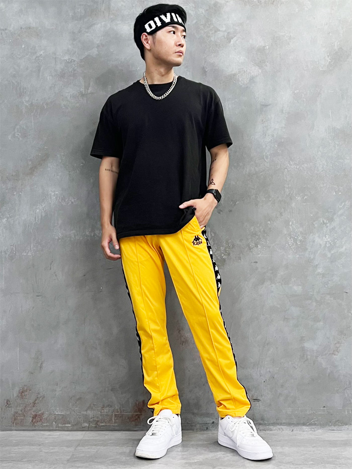 ブラックのパンツにホワイトのTシャツを合わせた定番の組み合わせ。