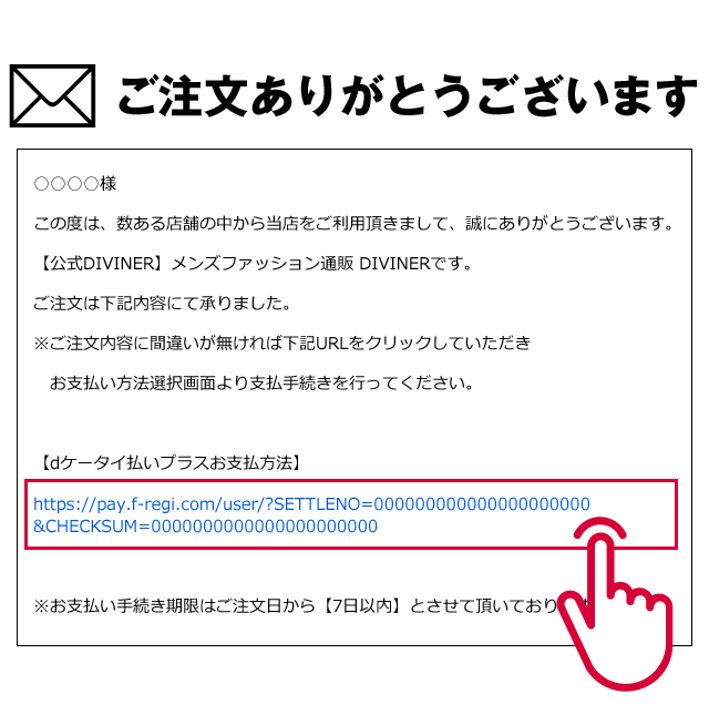 お支払い案内メール購入手続き完了後、当店からお支払い案内のメールをお送り致します。メールに記載のお支払いURLをクリックしてください。