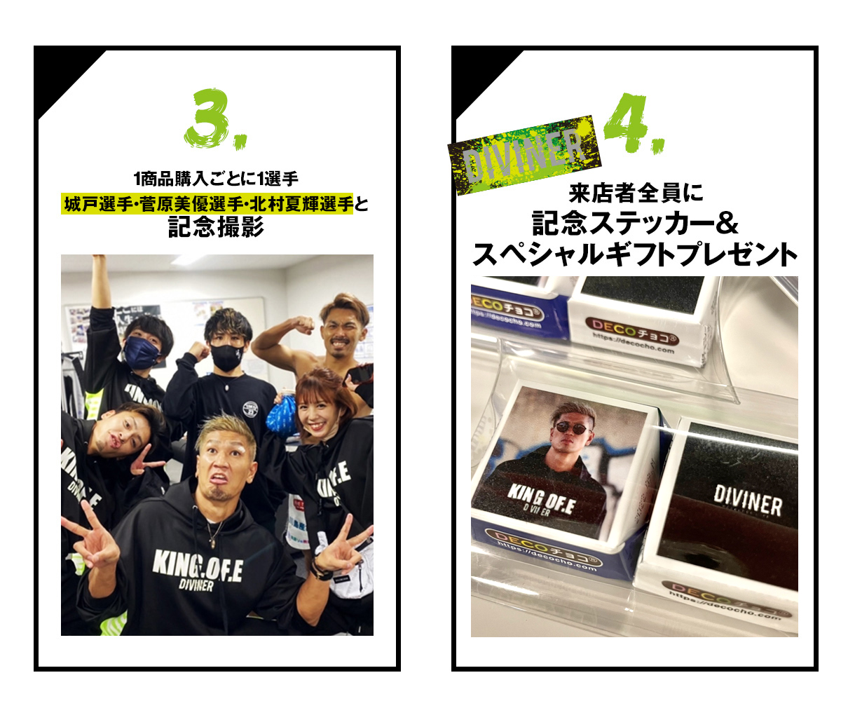 ご来店いただいた方にはDIVINER×城戸康裕選手限定ステッカー&スペシャルギフトをプレゼント。